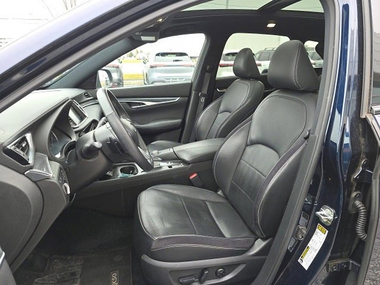 *Backup Camera*, *Bluetooth® Hands-Free Calling*, *Built-in USB ports*, *Remote Engine Start*, *All Wheel Drive*, *Heated Seats*, *Heated Steering Wheel*, *Sunroof/Moonroof*, *Push Button Start*, *Navigation / GPS*, *INFINITI InTouch Navigation *, *Alloy Wheels*, *XM Satellite Radio*, *Apple Car Play*, *Android Auto*, *Start the Vehicle from your Mobile Device*, *Forward Emergency Braking*, *Available Built-In 4G LTE Wi-Fi*, *Adaptive Cruise Control*, *Multizone Climate Systems*, *Steering Wheel-Mounted Controls*, *Intelligent Forward Collision Warning*, *Lane Keep Assist with Lane Departure Warning*, *Tire Pressure Monitoring System*, *Touch-Screen Display*, QX50 SPORT, AWD, 12 Speakers, 4-Wheel Disc Brakes, ABS brakes, Auto High-beam Headlights, Automatic temperature control, Bose Premium Audio System, Climate Controlled Front Bucket Seats, Dual front impact airbags, Dual front side impact airbags, Emergency communication system: INFINITI InTouch (1-year complimentary trial), Front dual zone A/C, Front fog lights, Garage door transmitter: HomeLink, Heated door mirrors, Heated front seats, Heated steering wheel, Memory seat, Navigation system: INFINITI InTouch Navigation, Power driver seat, Power Liftgate, Power moonroof, Power passenger seat, Remote keyless entry, Semi-Aniline Leather-Appointed Seat Trim, Ventilated front seats, Wheels: 20" Black Painted Machine Finished.