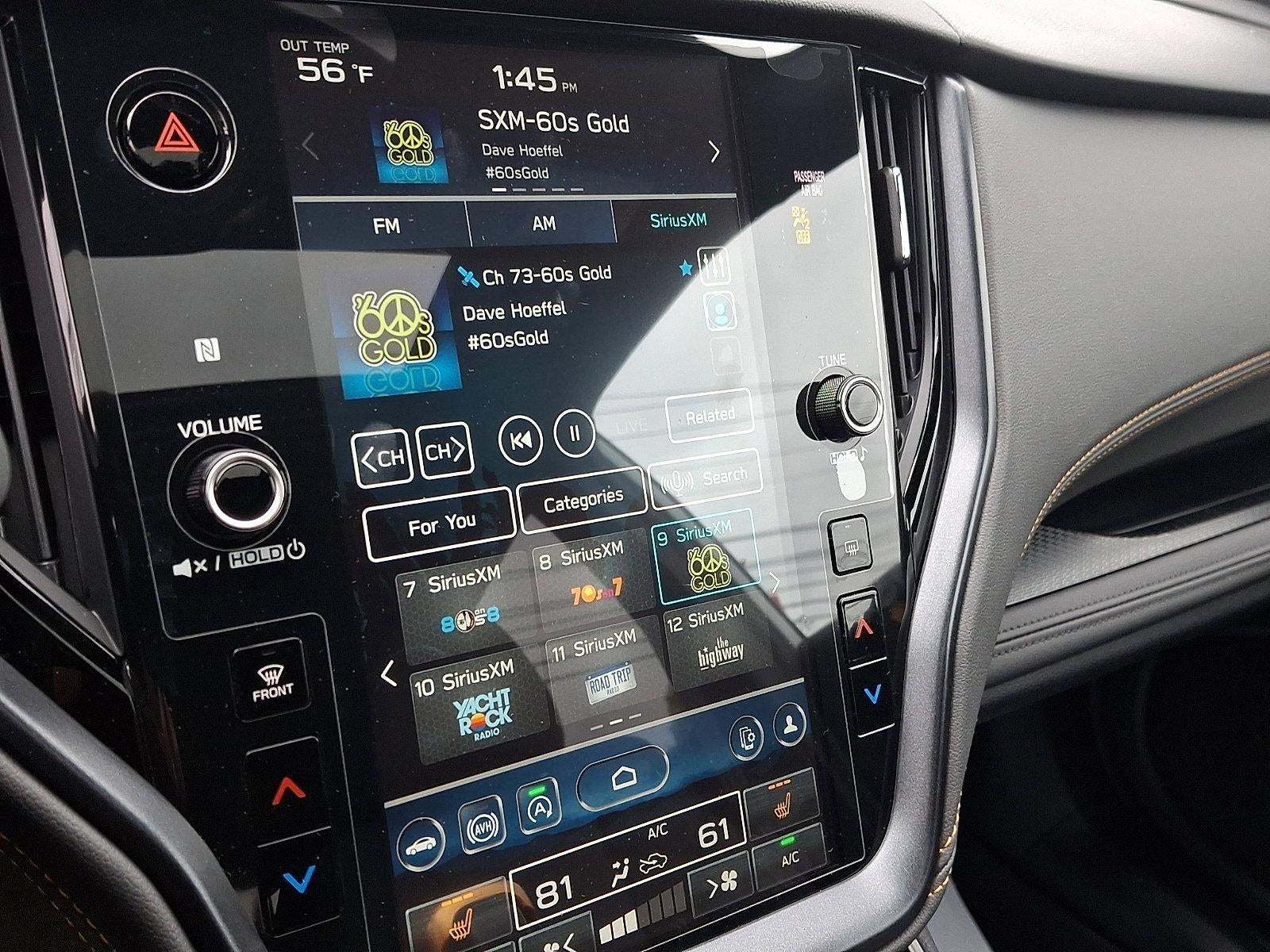 - Radio: Subaru 11.6" Multimedia Plus System -inc: AM/FM stereo, HD Radio, valet mode, multi-touch gesture high resolution display screen, voice activated controls, Bluetooth® audio streaming and hands-free phone connectivity w/SMS text messaging (refer to subaru.com for cell phone compatibility), Near Field Communication (NFC), iPod control capability, SiriusXM w/360L (4 months free trial/subscription required after), SiriusXM Travel Link (3 years free trial/subscription required after), smartphone integration for Android Auto and Apple CarPlay w/full screen view and wireless connection, USB and Over The Air (OTA) audio system update, audio system and Bluetooth® steering wheel control switches, 576 watt harman/kardon surround sound system w/12 speakers, illuminated 3.5mm auxiliary input jack and illuminated USB-A and USB-C input/charge ports