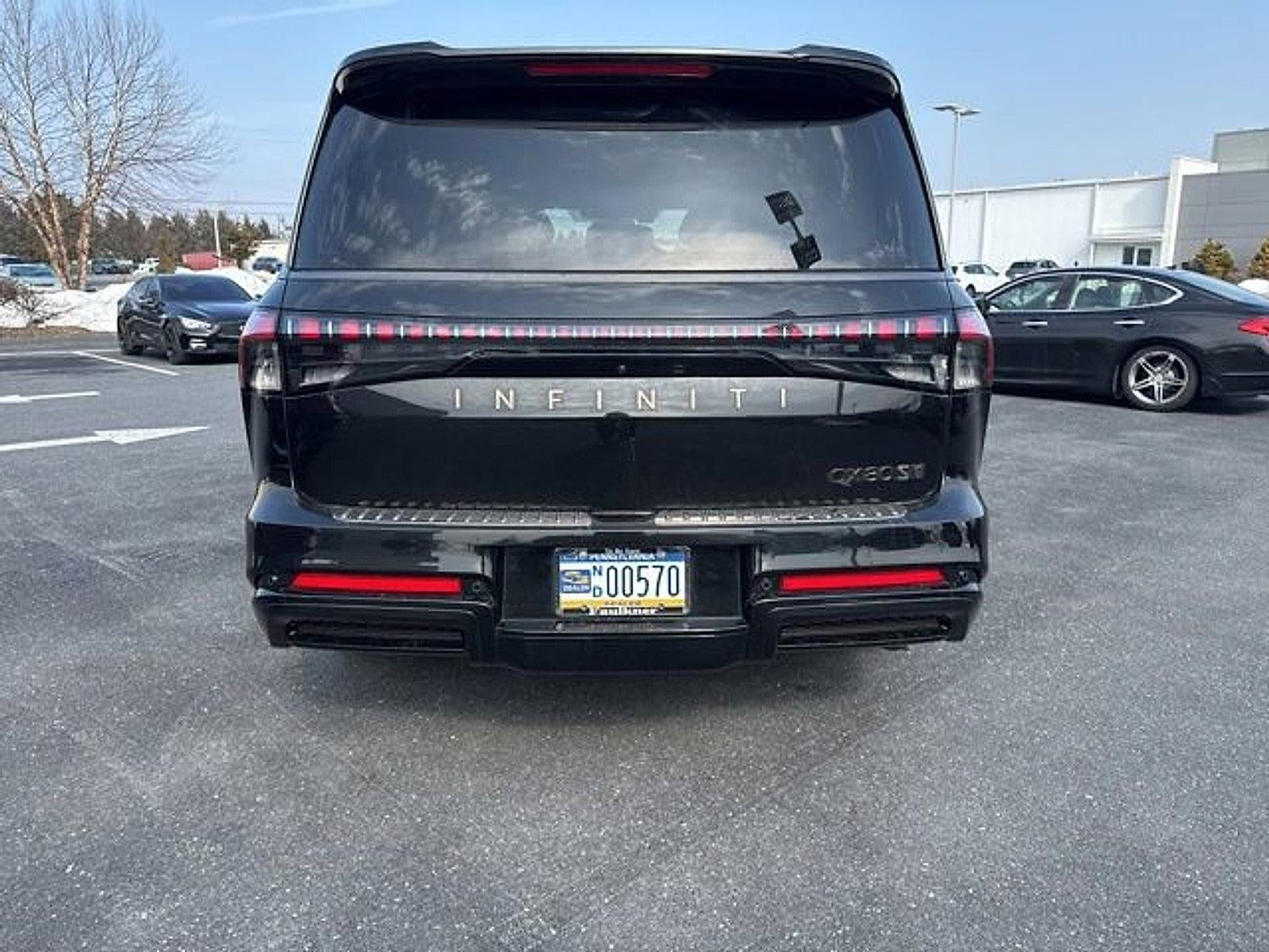 *Backup Camera*, *Bluetooth® Hands-Free Calling*, *Remote Engine Start*, *All Wheel Drive*, *Leather Seats*, *Heated Seats*, *Heated Steering Wheel*, *Around View Monitor Advanced Technology*, *Sunroof/Moonroof*, *Navigation / GPS*, *INFINITI InTouch Navigation *, *XM Satellite Radio*, *Apple Car Play*, *Android Auto*, *Forward Emergency Braking*, *Adaptive Cruise Control*, *Multizone Climate Systems*, *Steering Wheel-Mounted Controls*, *Intelligent Forward Collision Warning*, *Lane Keep Assist with Lane Departure Warning*, *Memory Seat Package*, *Premium Audio Package*, *Tire Pressure Monitoring System*, *Rear Climate Package*, 3rd row seats: bench, 4-Wheel Disc Brakes, ABS brakes, Active Cruise Control, Adaptive suspension, AM/FM radio: SiriusXM with 360L, Anti-whiplash front head restraints, Apple CarPlay/Android Auto, Auto High-beam Headlights, Auto-leveling suspension, Automatic temperature control, Black Roof Rail Crossbars, Dark Chrome Rear Bumper Protector, Dual front impact airbags, Front dual zone A/C, Heads-Up Display, Heated and Climate Controlled Front Bucket Seats with Massage, Heated door mirrors, Heated front seats, Heated rear seats, Heated steering wheel, Leather steering wheel, Memory seat, Power driver seat, Power Liftgate, Power moonroof, Power passenger seat, Power steering, Radio: Klipsch Premiere Audio System, Rear air conditioning, Reclining 3rd row seat, Sport Exterior Package, Telescoping steering wheel, Ventilated front seats, Ventilated rear seats, Wheels: 22" x 8.5J Unique SPORT Alloy.